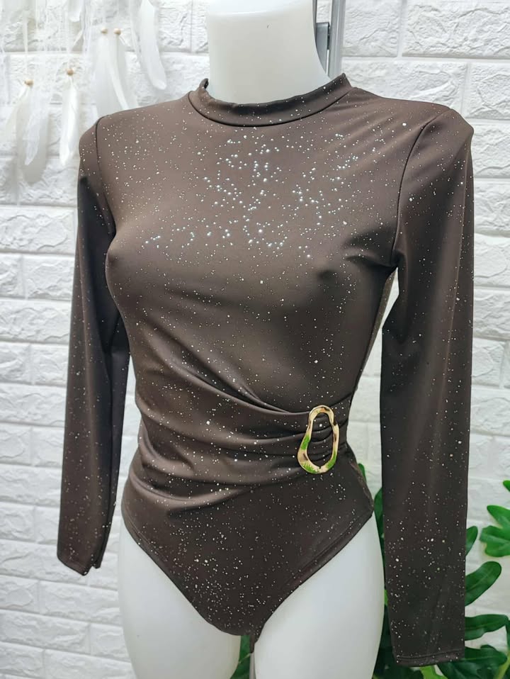 Body de lycra con brillo combinado con anilla dorada lateral.