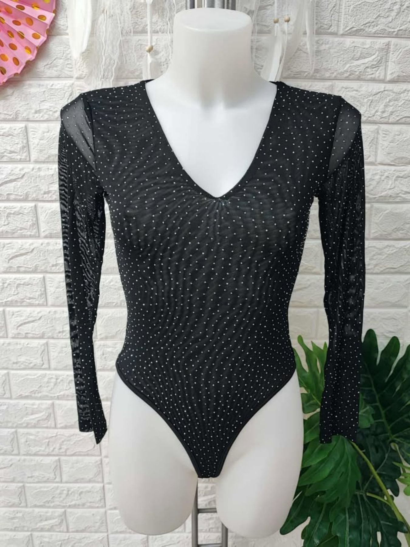 Body de tul combinado con transparencias y brillo de strass plateado.