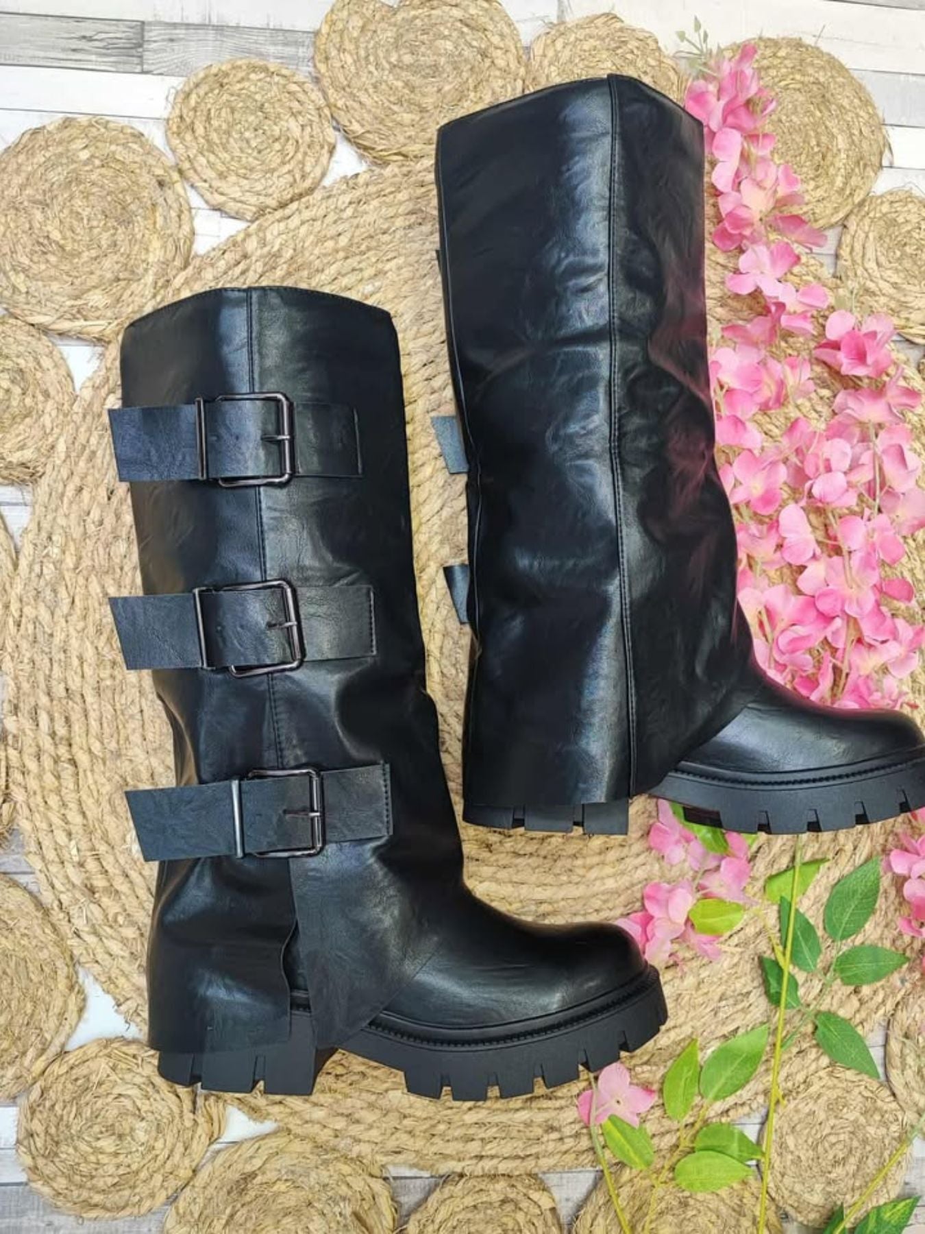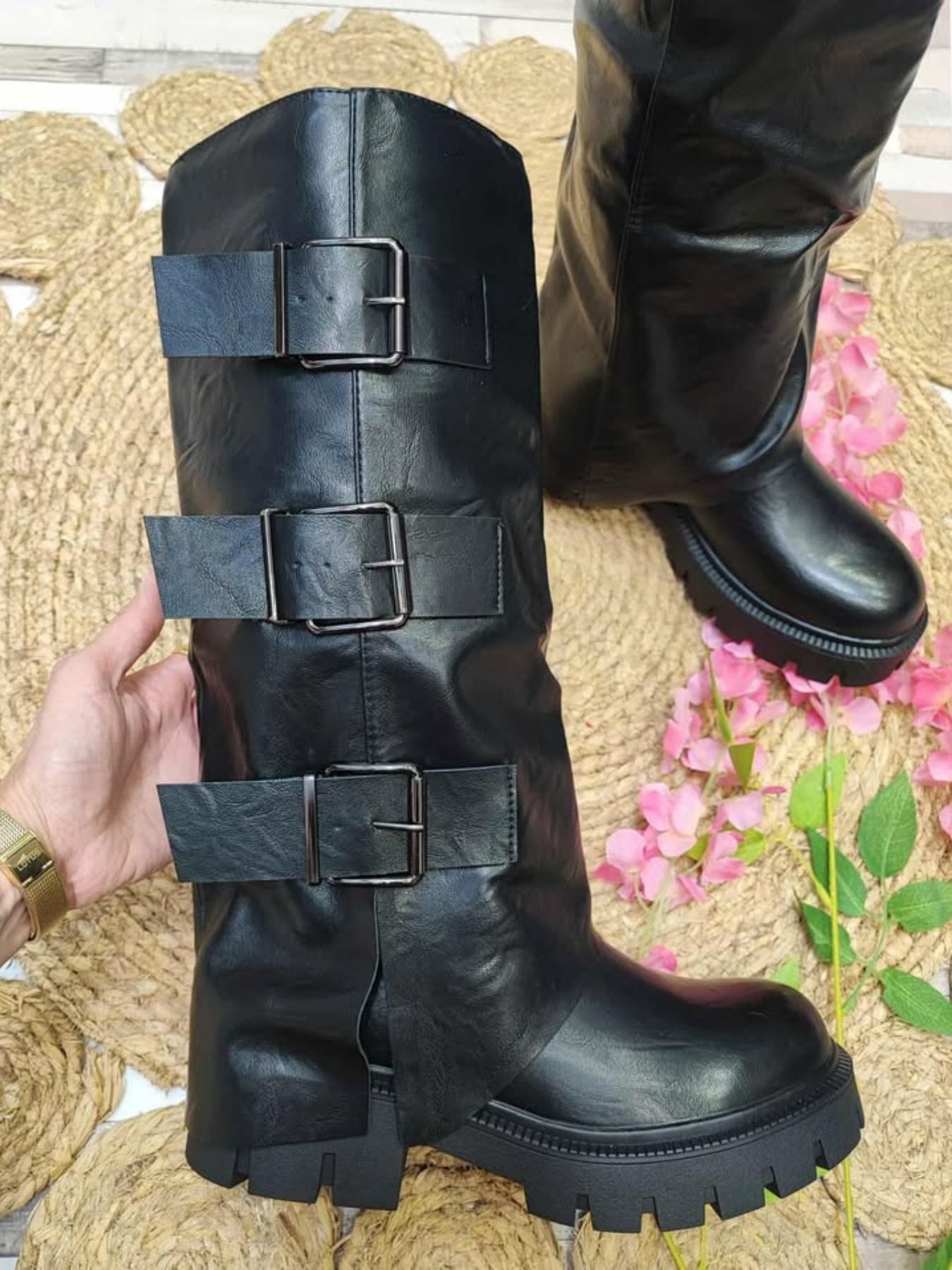 Bota de polipiel combinada con hebillas plateadas.