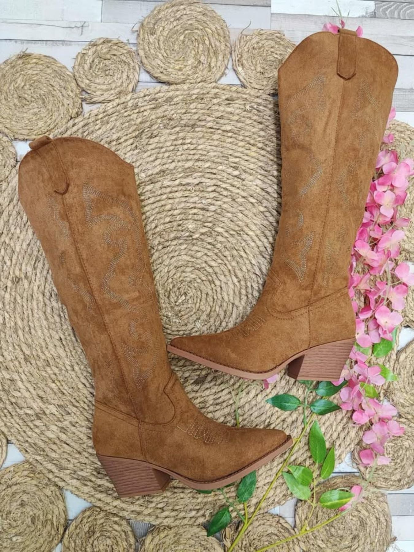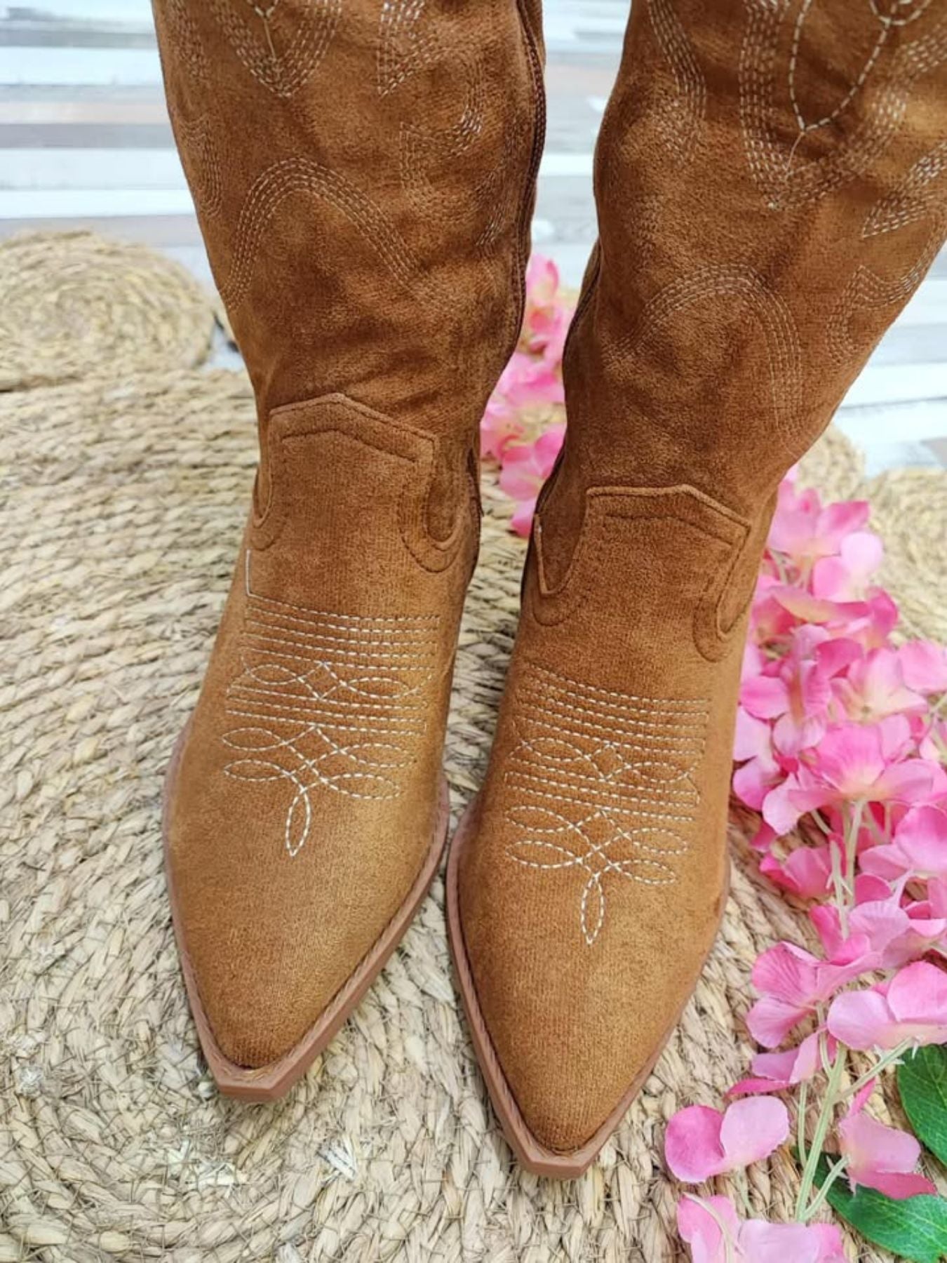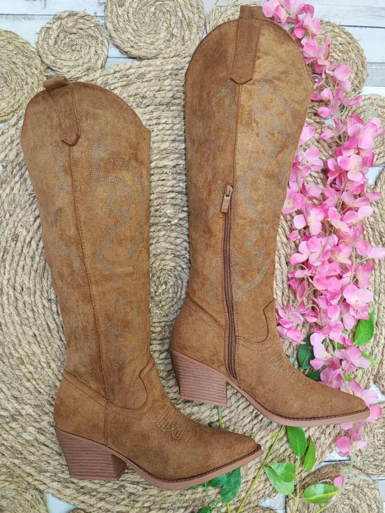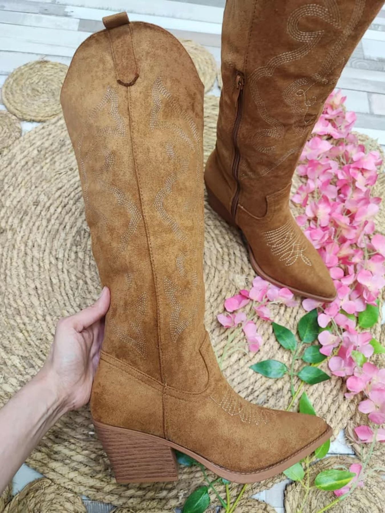 Bota campera de antelina combinada con bordados.