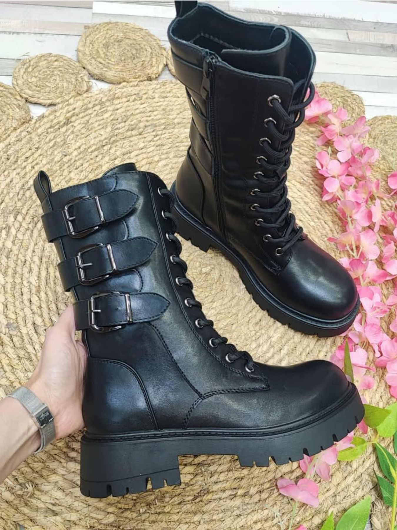Botin de polipiel combinado con hebillas.