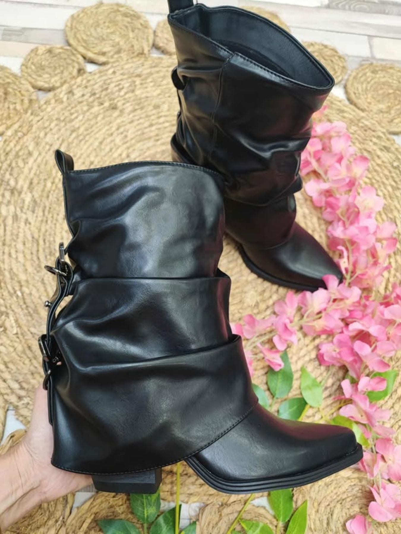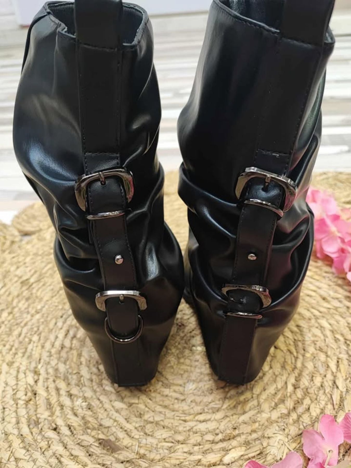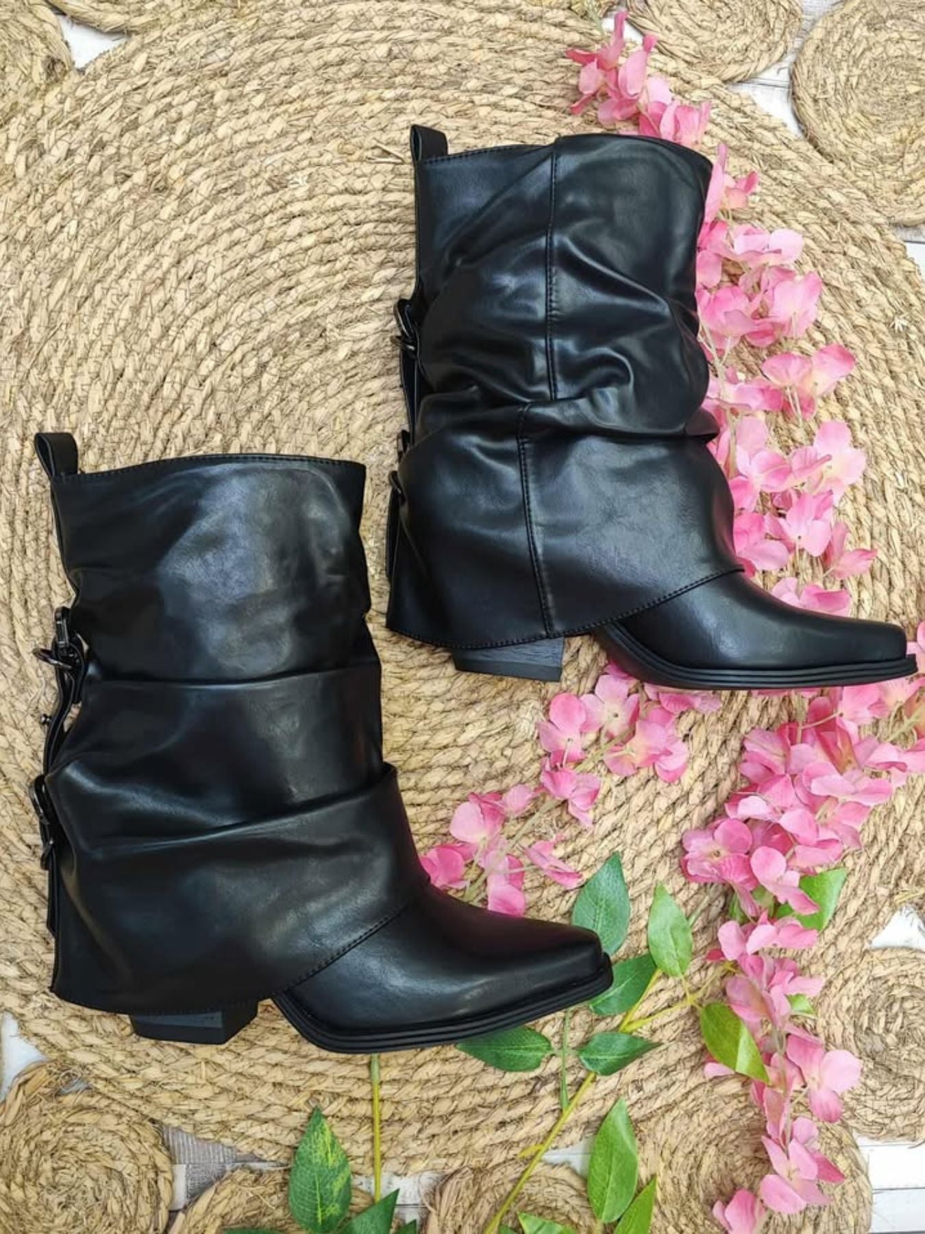 Botin campero tipo polaina con detalle de hebillas traseras.