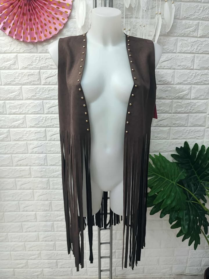 Chaleco de antelina combinado con flecos y tachuelas en color dorado.