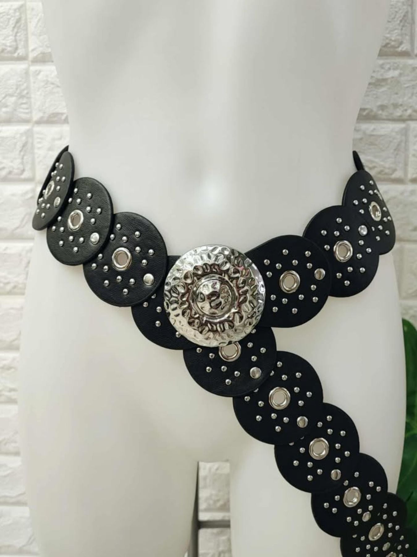 Cinturon de polipiel con tachuelas y hebilla plateada.