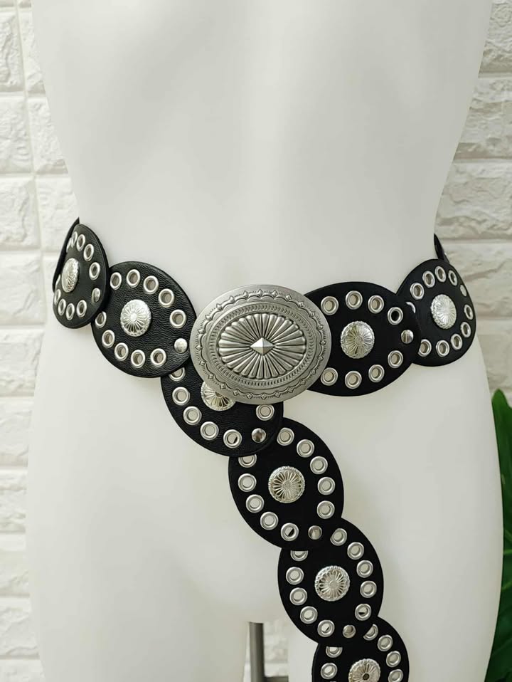 Cinturon de polipiel con tachuelas y hebilla plateada.
