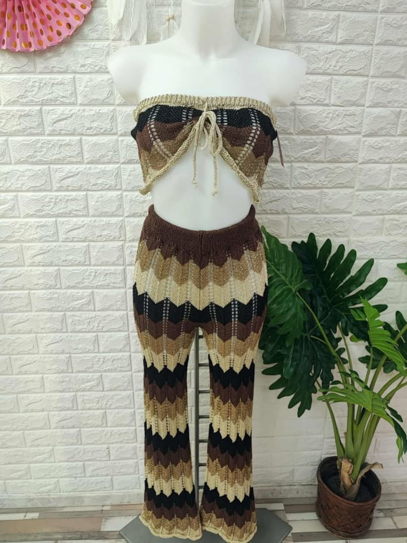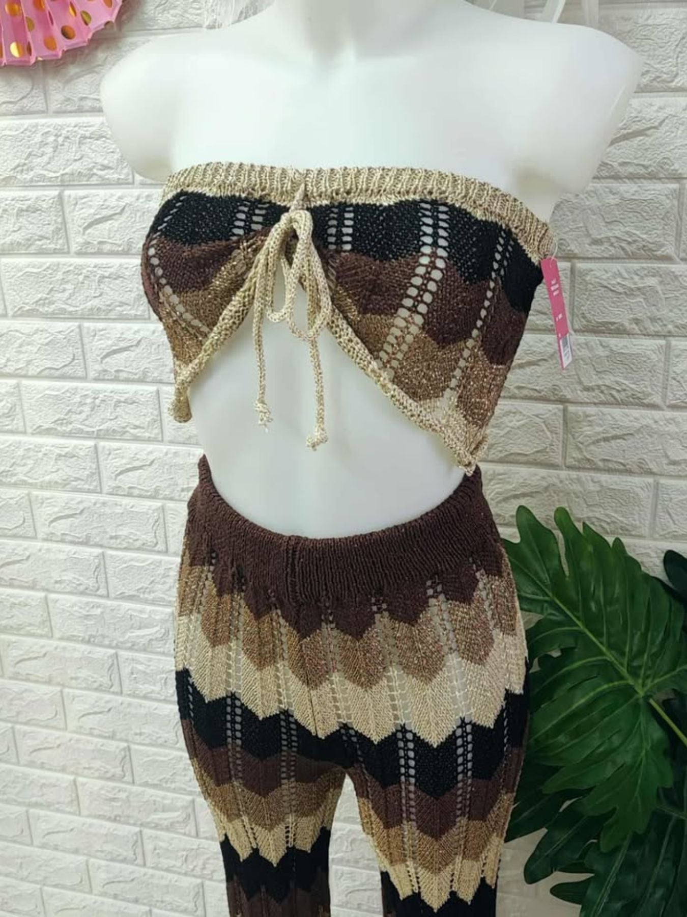 Conjunto de top y pantalon de crochet combinado con hilo de brillo.