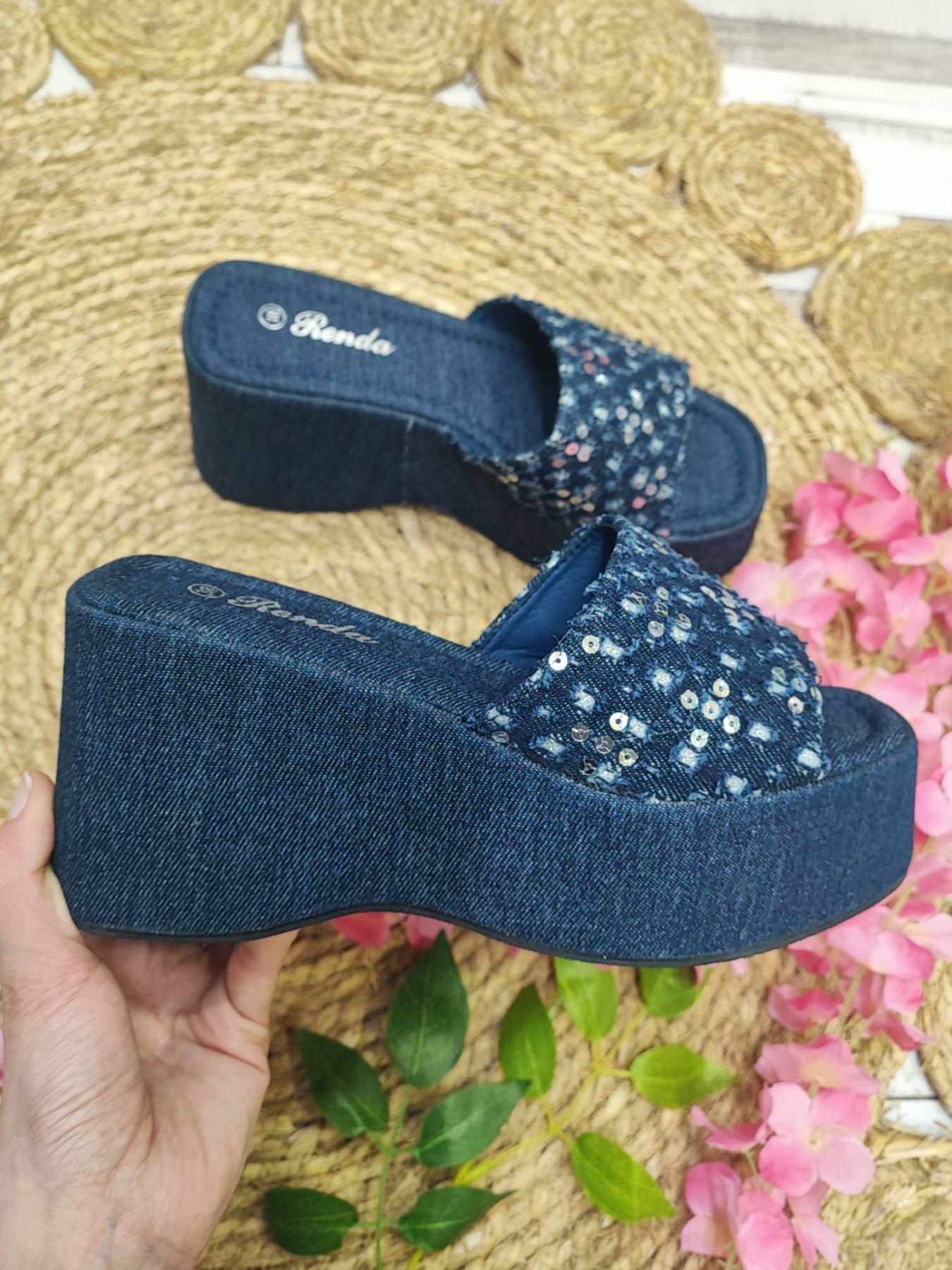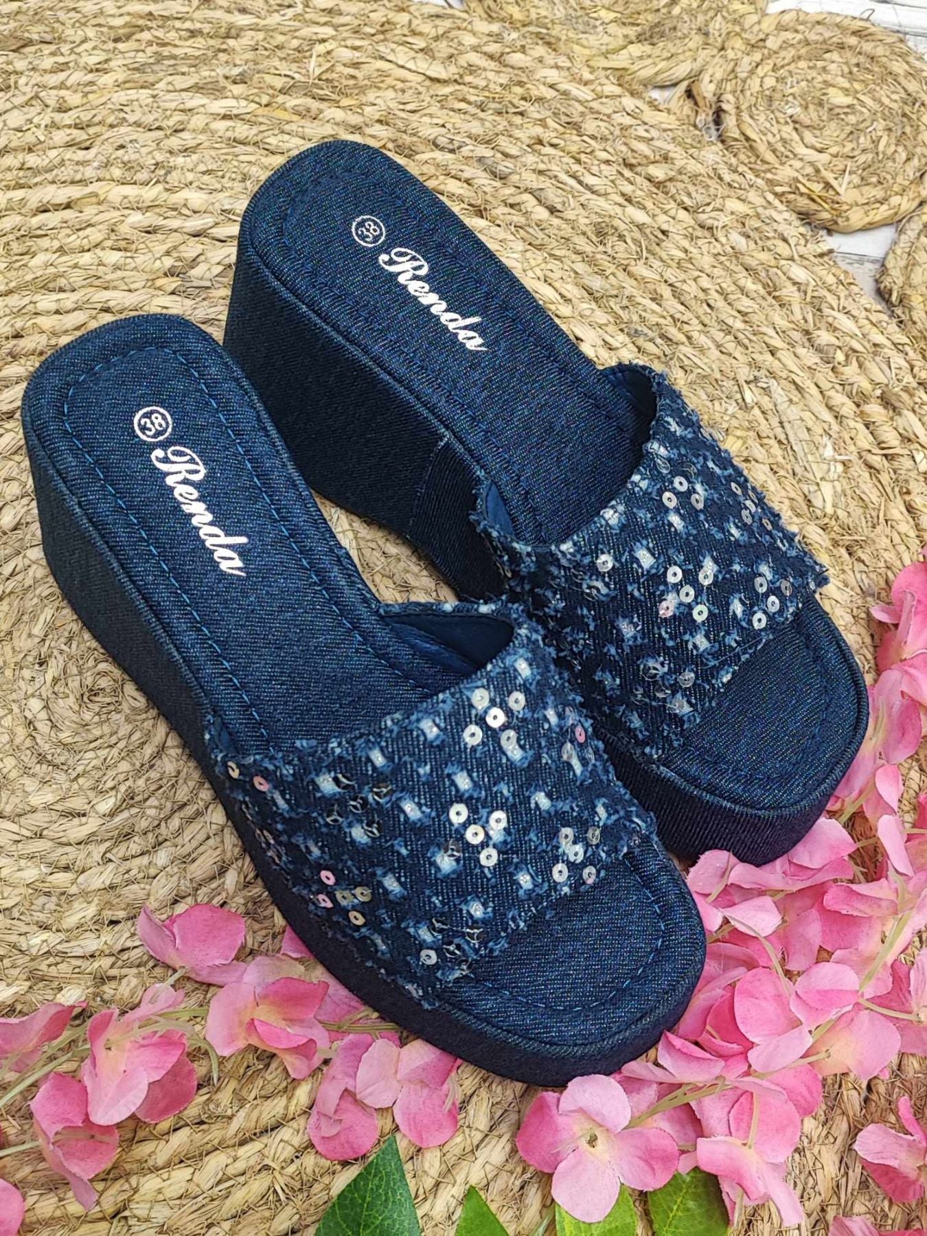 Sandalia de cuña combinada en tejano y paillettes plateados.