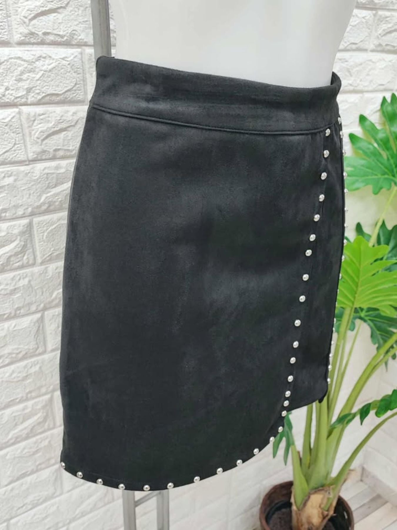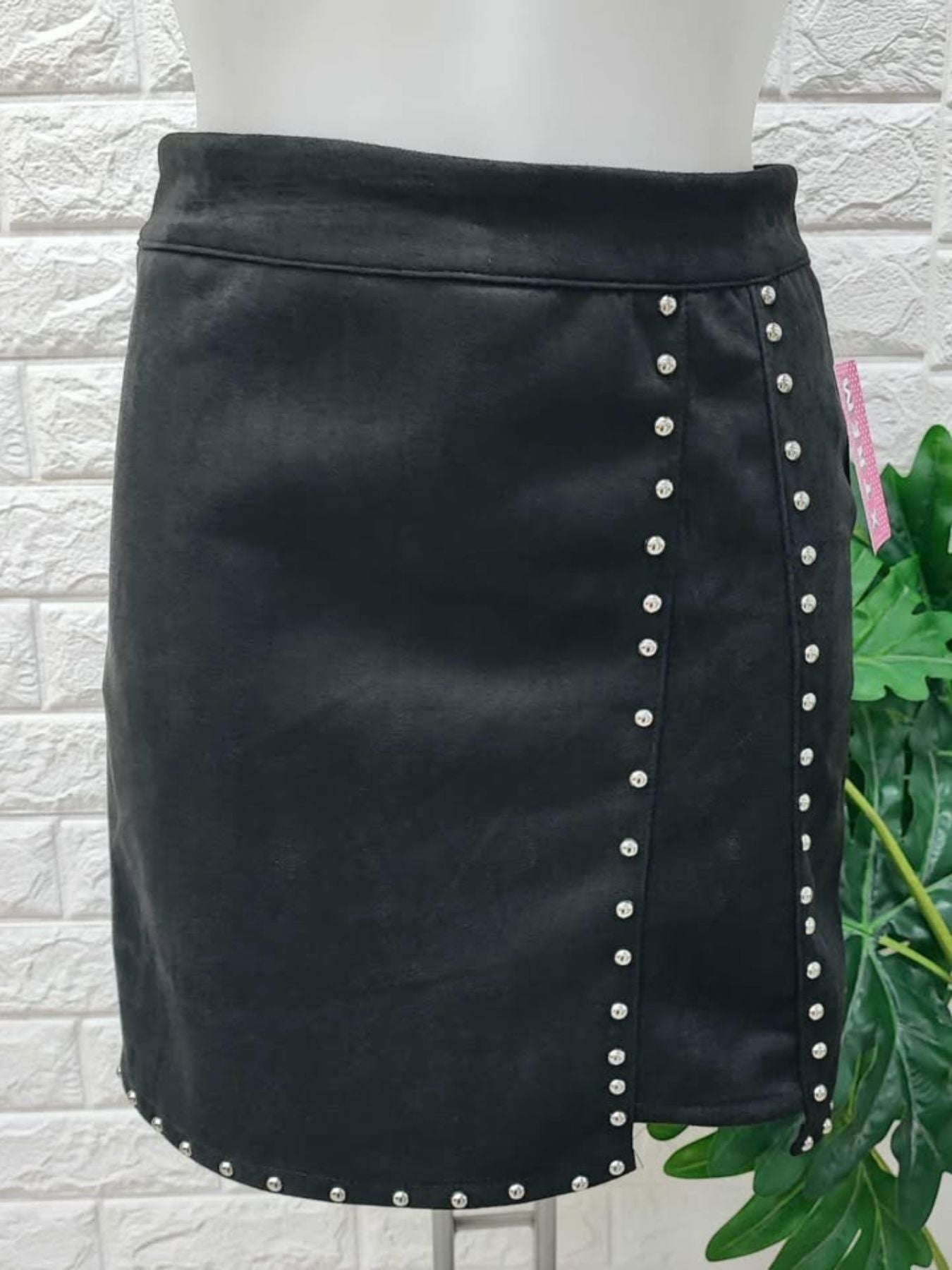 Falda de antelina combinada con tachuelas plateadas.