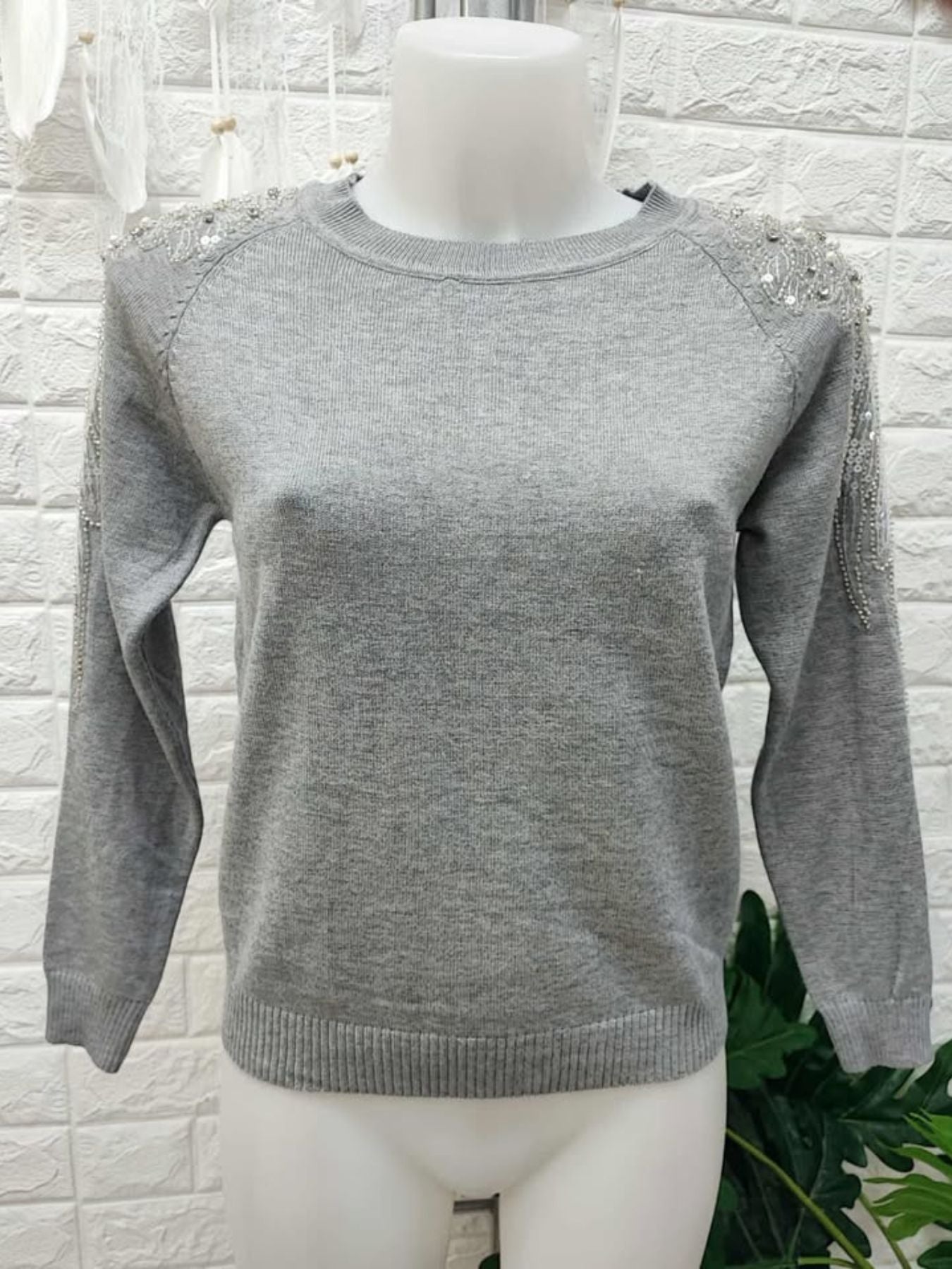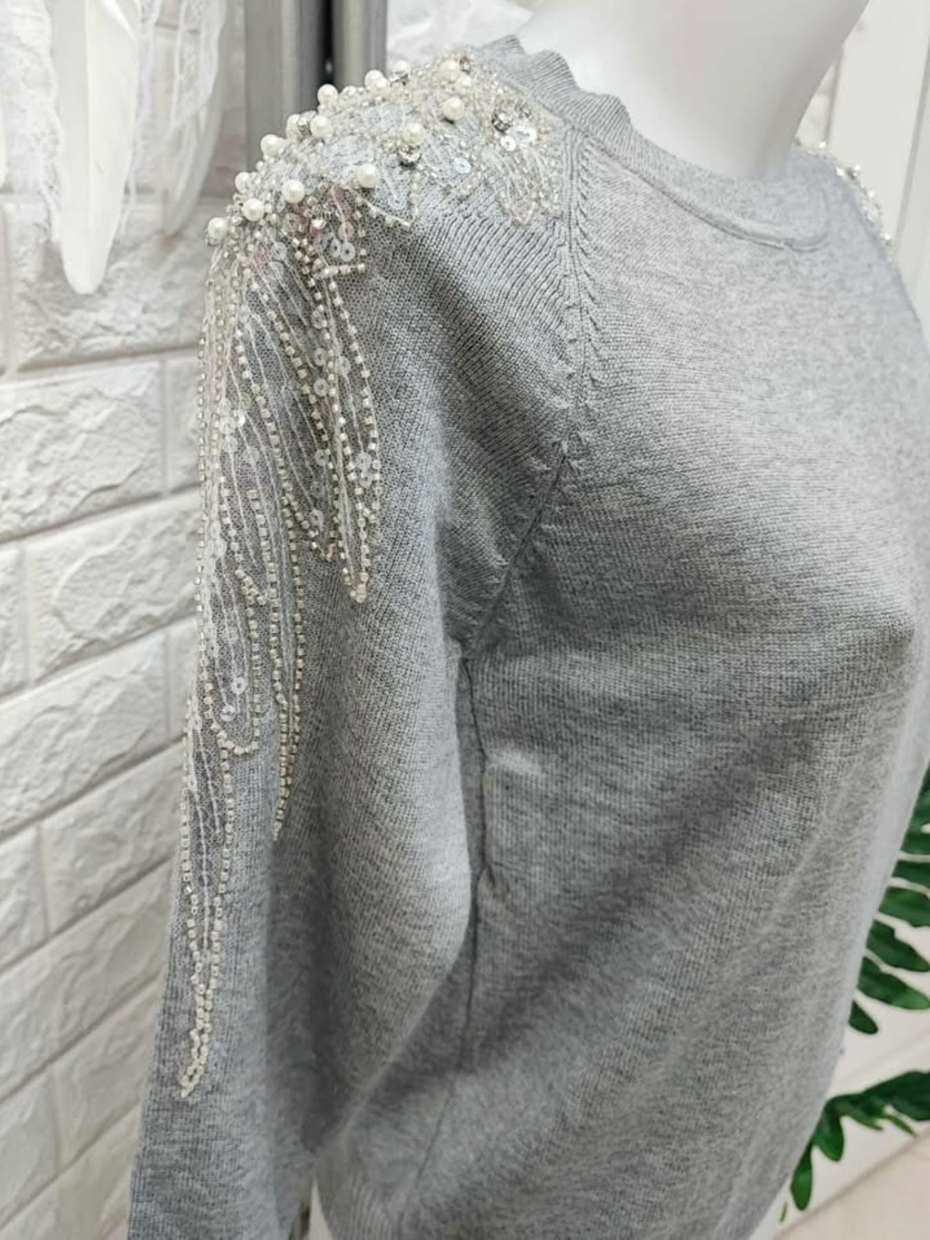 Jersey de punto elastico combinado con detalle en el hombro de strass y perlas.