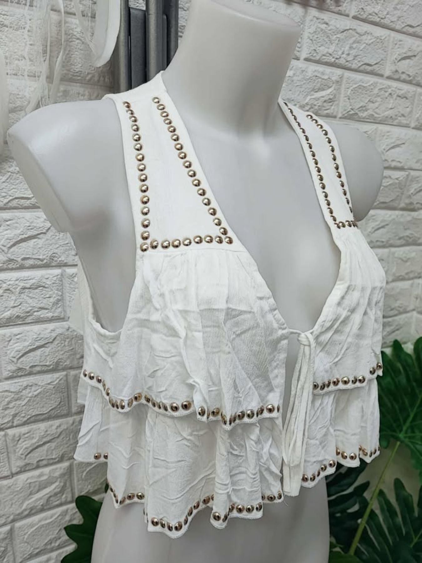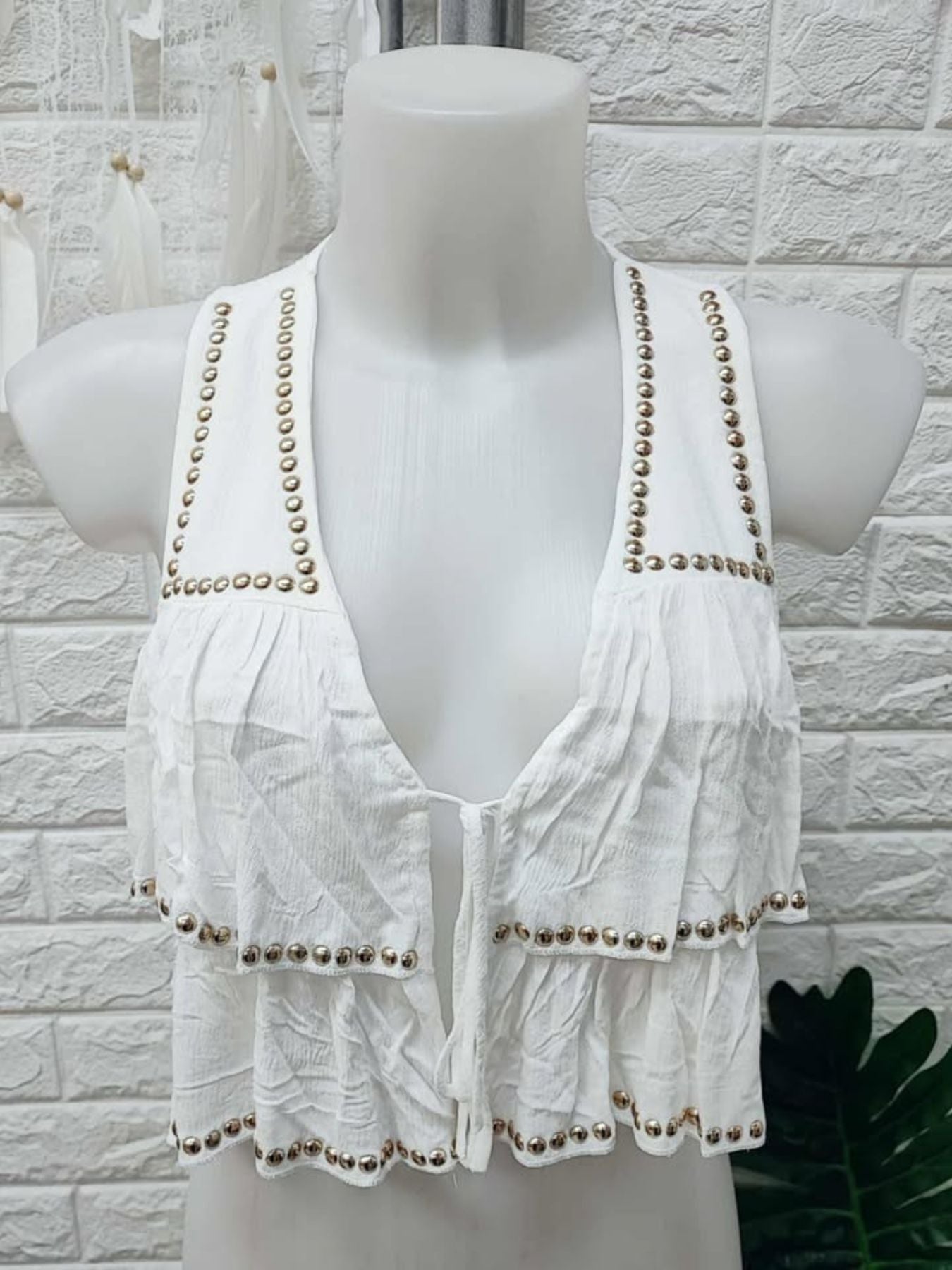 Top tipo chaleco de gasa combinado con tachuelas doradas.