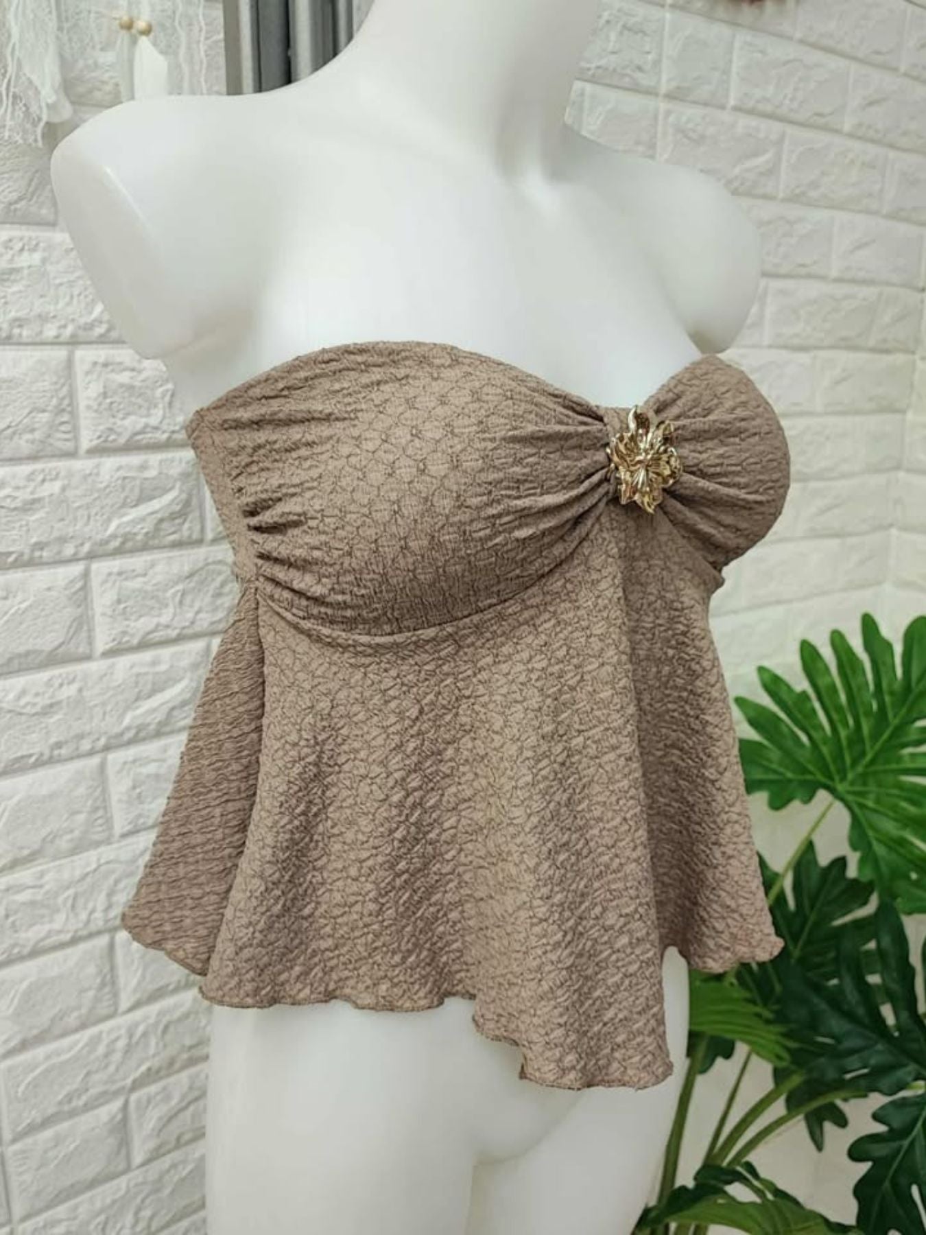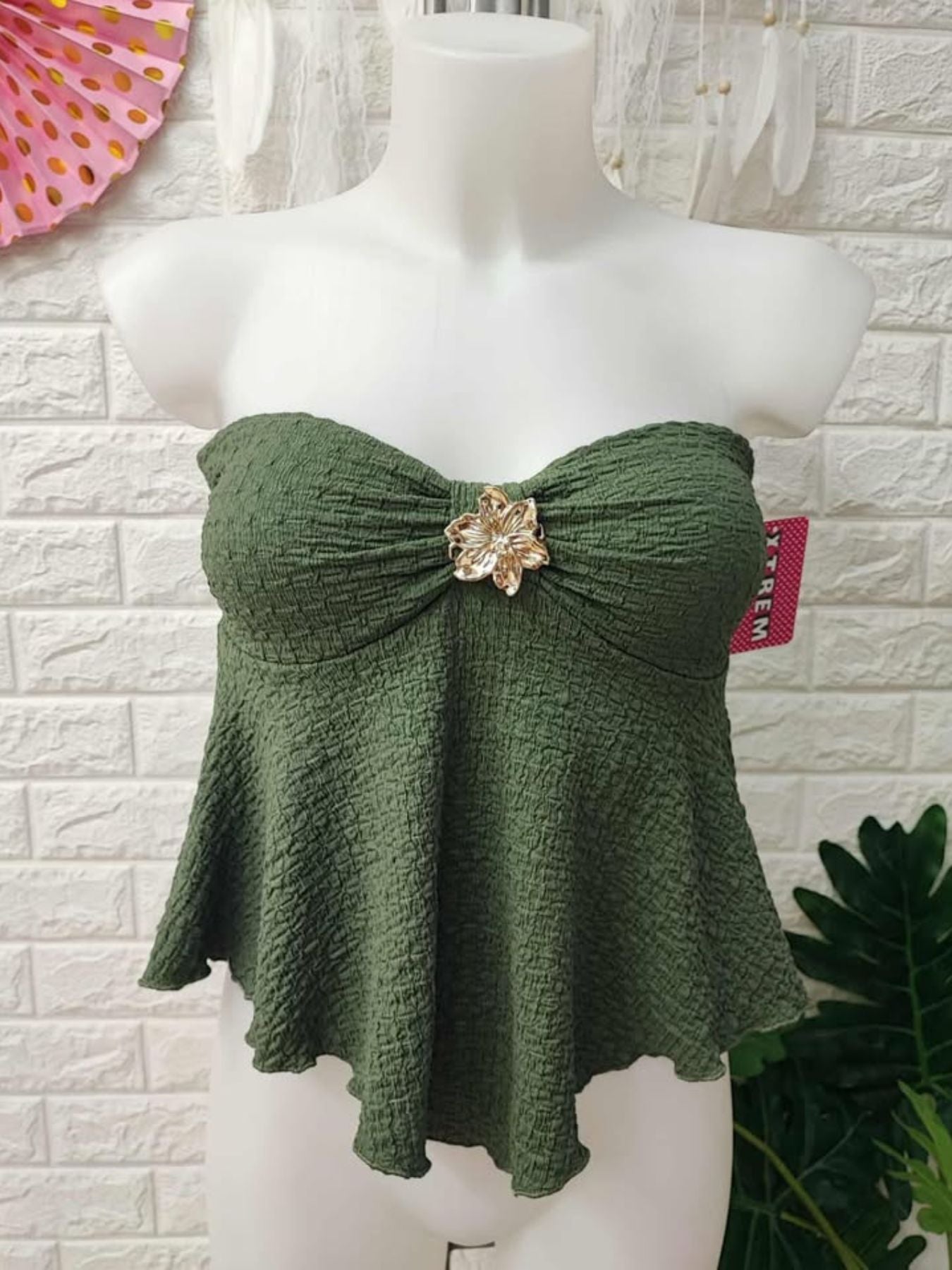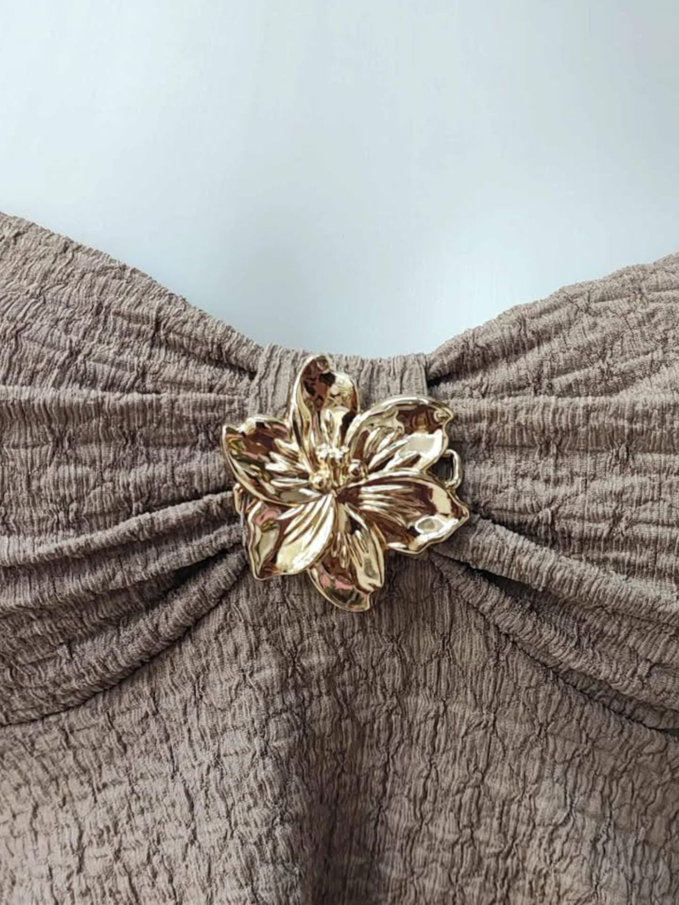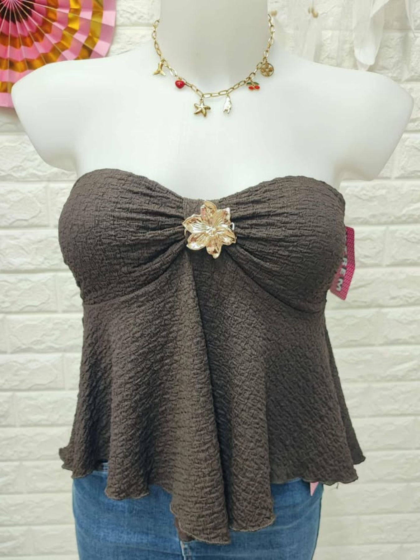 Top elastico combinado con flor metalica dorada.
